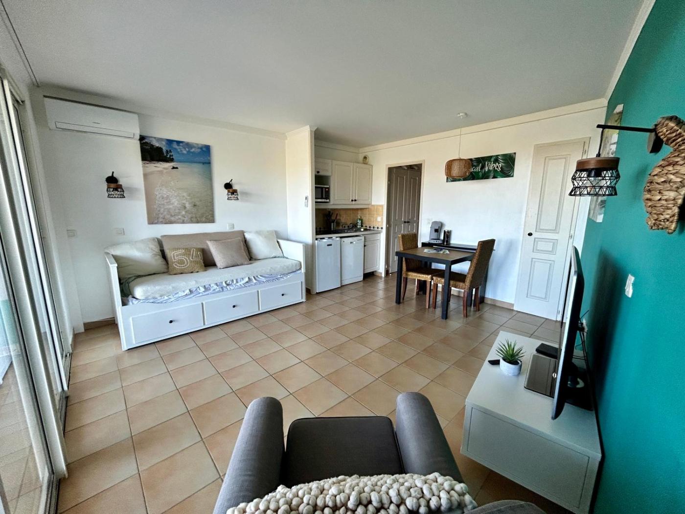 Appartement 1 Chambre. This apartment features a infinity pool. Boasting a private entrance, this apartment features 1 living room, 1 separate bedroom and 1 bathroom with a bath and a hairdryer. Guests can make meals in the kitchenette that has a stovetop, a refrigerator, a dishwasher and kitchenware. Featuring a terrace with sea views, this apartment also features a coffee machine and a flat-screen TV. The unit has 2 beds.