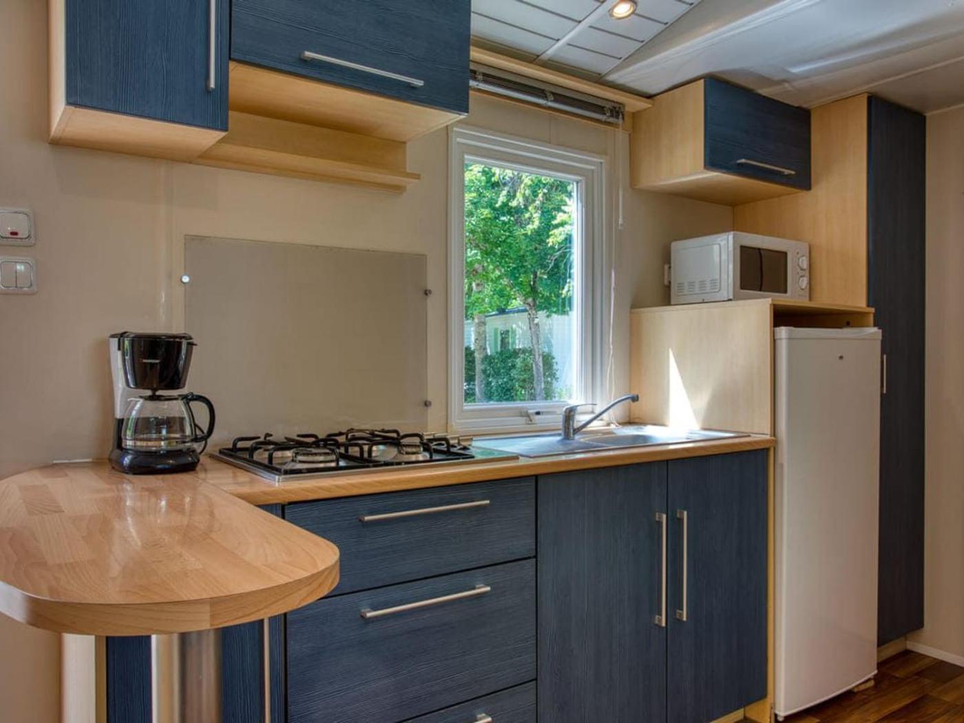 Mobile Home. Featuring a private entrance, this mobile home comprises 2 bedrooms, 1 bathroom and a kitchen. Meals can be prepared in the kitchen, which comes with a refrigerator, kitchenware, a microwave and a toaster. This mobile home features a coffee machine, a dining area, a TV and a terrace.