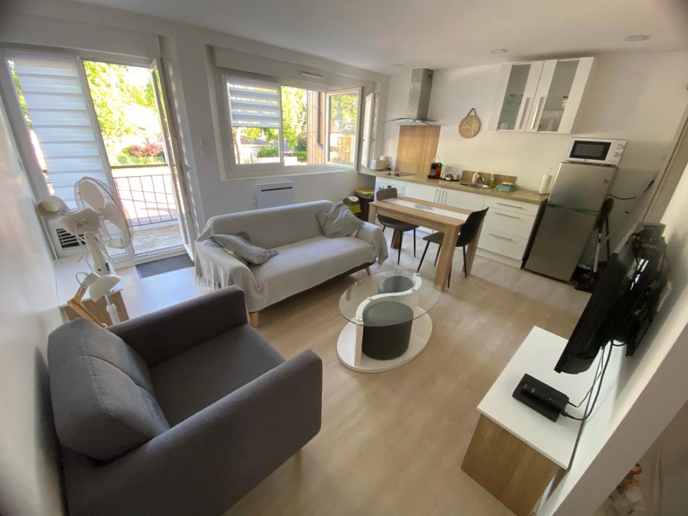 Appartement 1 Chambre. Featuring a private entrance, this apartment consists of 1 living room, 1 separate bedroom and 1 bathroom with a shower and a hairdryer. The fully equipped kitchen has a stovetop, a refrigerator, kitchenware and an oven. This apartment features a washing machine, soundproof walls, a flat-screen TV and a terrace. The unit offers 2 beds.